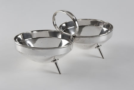 manufactured by Hukin & Heath, shape 2523, composed of two circular dishes, joined at the central ring handle, raised on four splayed tapered cylindrical legs