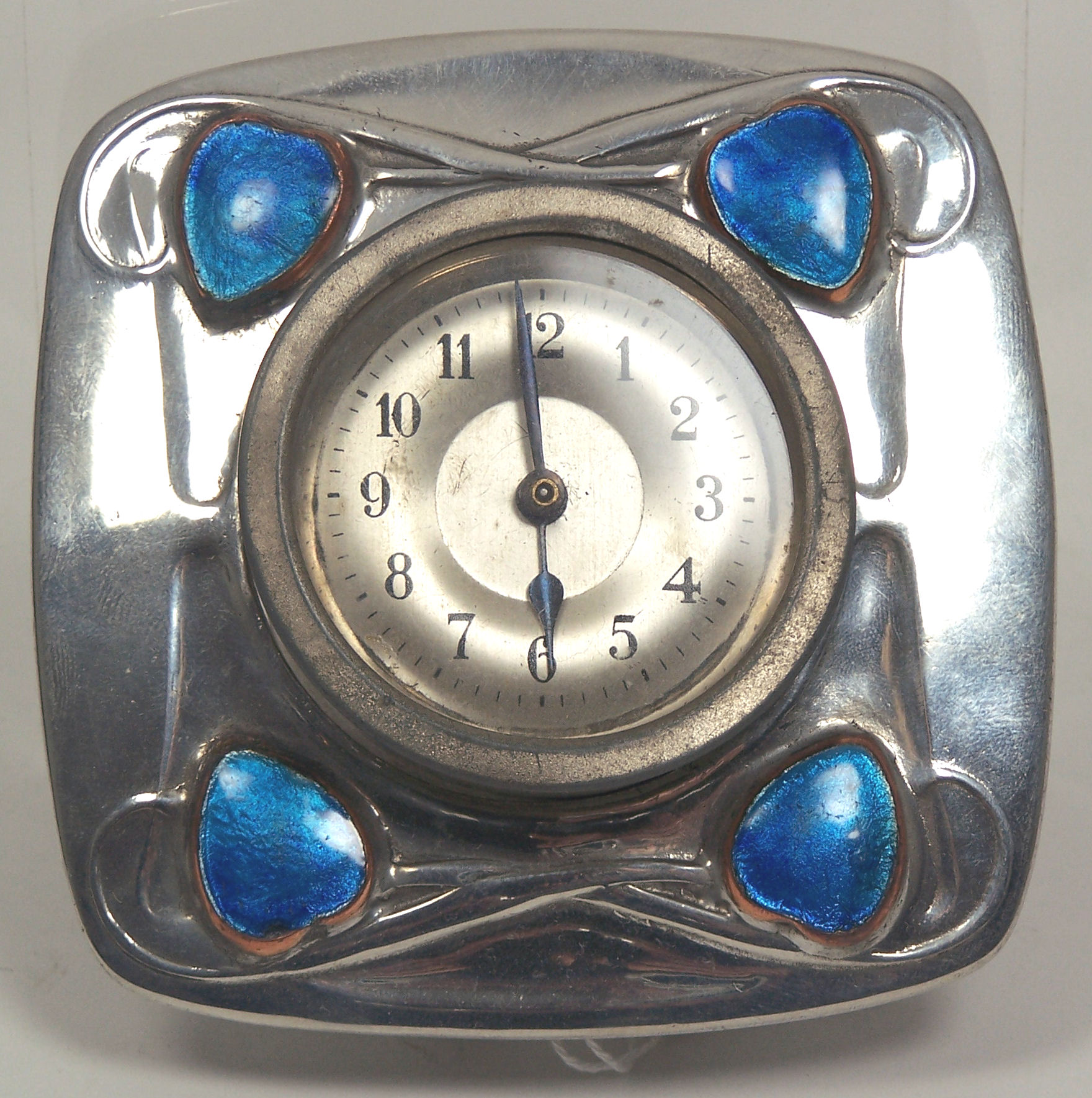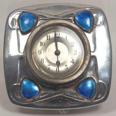 for Liberty & Co., of swollen rectangular outline, the associated circular dial and movement enclosed by frame with stylised plant forms embellished with turquoise enamel buds, stamped marks, no. 0482