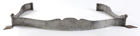 of serpentine form, with scrolling hinged sides, the angles with ball finials above leaf-shaped pad feet