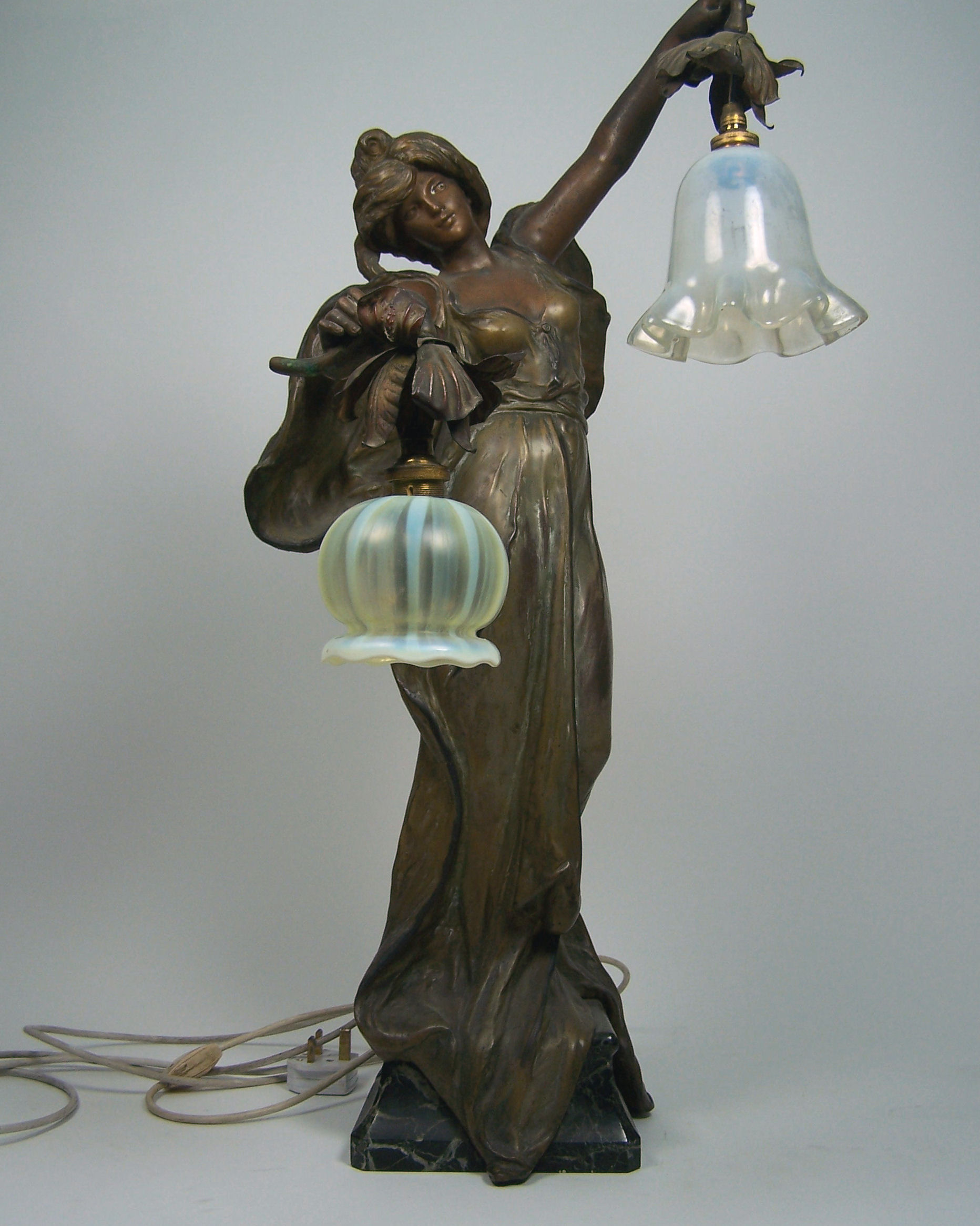 cast as a maiden in a flowing robe, holding aloft two light fittings with matched Vaseline glass shades, the whole raised on a marble plinth, bears signature