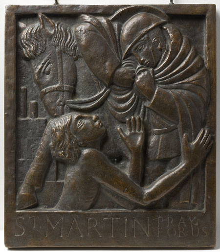 patinated bronze relief panel, cast inscription 'St Martin/ Pray/ For Us'