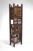 the twin train movement with circular dial enclosed by inset blue glass spandrels, supported by square uprights with slatted and cross framed panels