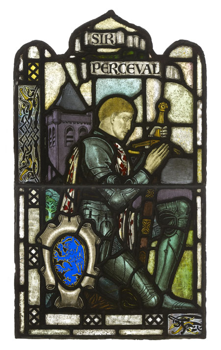 Sir Percival and the Holy Grail, one panel depicting the knight inscribed 'Sir Percival', the other depicting the Grail with female attendants, signed and dated 'Guthrie & Well Ltd. 1930' (2)