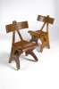 each with carved moulded tablet toprail with six central ebony roundels, on chamfered A-frame, the moulded solid seat on splayed trestle ends with pierced roundels, joined by a similar stretcher (2)