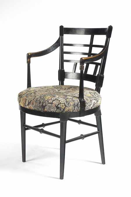 probably manufactured by William Watt, the curved open lattice back above open arms above stuffover seat on turned legs linked by stretchers
