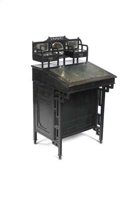 the superstructure with three mirrored panels and two drawers, raised on strut supports above a loping fall with fitted interior, the base with panelled door to one side and drawers to the other, and with fretwork bracket decoration