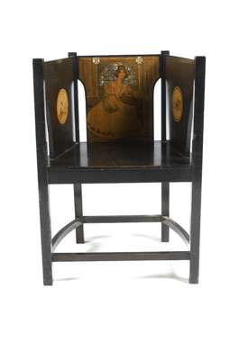 the solid back and arms painted and inlaid with mother of pearl with the image of a maiden seated by a window, with two roundels to the arms depicting a windmill and a sailing ship, above a solid seat raised on square legs linked by stretchers