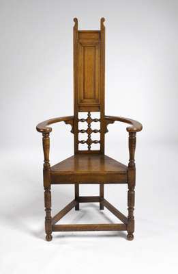 of 'cacateuse' style, the tall panelled back with scrolled uprights and decorative bobbin-work to the lower panel, the inscrolling arms above a solid seat, on baluster legs united by perimeter stretchers