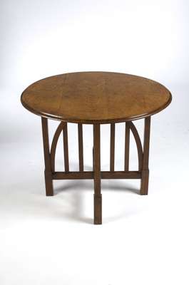the circular to above raised on square legs with block feet linked by cross stretchers and further supported by arched slatted brackets
