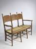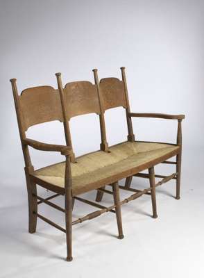 the arched top rails with ring-turned uprights above curved open arms and enclosing a later rushed seat, the whole raised on ring-turned legs linked by a stretcher