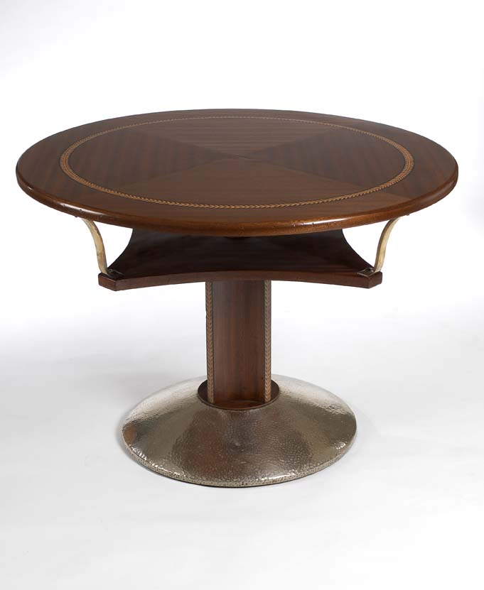 the circular quarter-veneered top with inlaid leaf band, above concave lover tier and convex columnar support with circular hammered base covered with hammered silvered metal