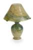 the ovoid footed body of lemon glass with mottled white inclusions and with green and blue inclusions to the rim, surmounted by a corresponding shade of tapering cylindrical form (small repaired chip to foot rim) (2)