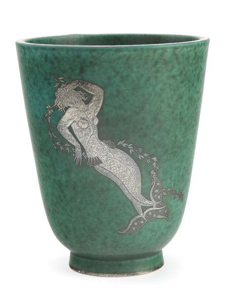 silver overlaid earthenware, decorated with a mermaid and reserved on a mottled green ground, painted and printed marks 'Gustavberg/Argenta/ 978 II'