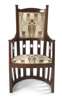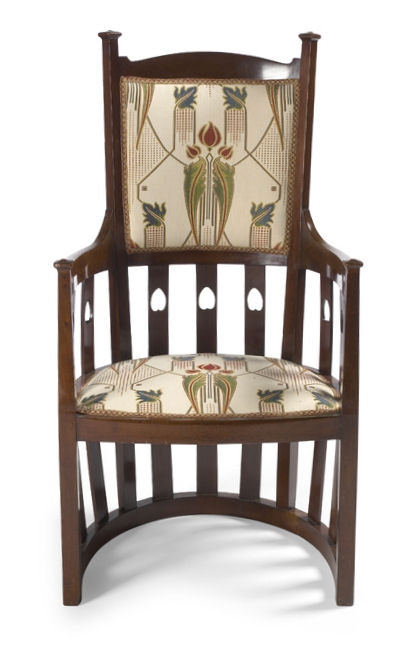 mahogany, in the manner of J.S. Henry, with upholstered panel back above curved arms and slatted gallery pierced with hearts, the upholstered panel seat on square supports linked by a stretcher