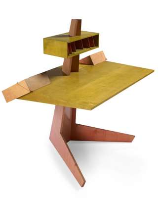 stained sycamore ply, the superstructure with pigeonholes and lidded stationary compartments raised above a V-shaped support