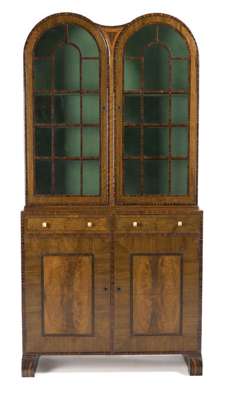 walnut with rosewood banding, the double-domed top with astragal glazed doors enclosing adjustable shelves, above a pair of frieze drawers with ivorine pull handles and with a pair of cupboard doors below, the whole raised on convex-moulded trestle feet, bears ivorine makers label and paper label inscribed 'Signed Edition Series/ designed by/ Ambrose Heal/ made by Heal & Son/ 1929'