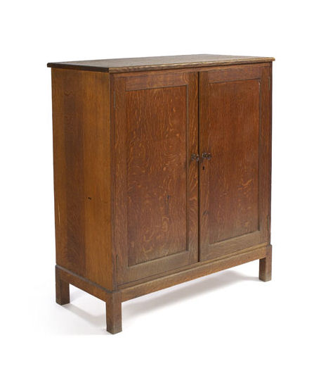 the rectangular top above twin panelled doors enclosing shelves raised on square legs, bears maker's label