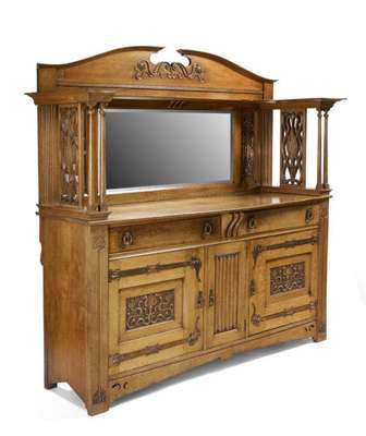 the foliate carved and arched mirror back between embossed copper panels, on twin turned uprights above a pair of frieze drawers and a central linen-fold door between pomegranate carved cupboard doors with embossed copper strap hinges and foliate stem incised uprights, on pierced apron and stem feet