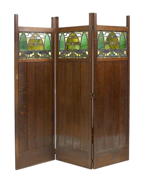 oak framed, inset with three stained and leaded glass panels