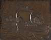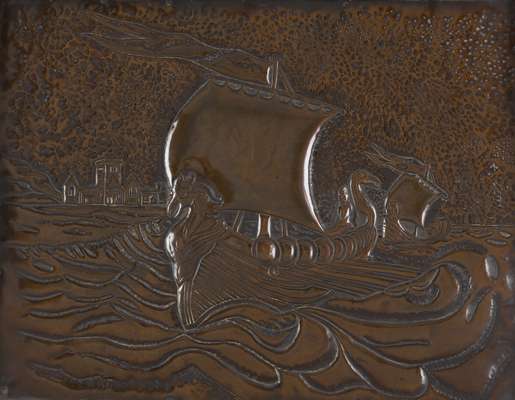 copper, of rectangular outline within an oak frame, the panel repousse decorated with a longboat in full sail with Iona Abbey in the distance