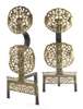 each with cut out circular rosettes, chased with flowering foliage above a pierced panel below on wrought iron stand (2)