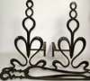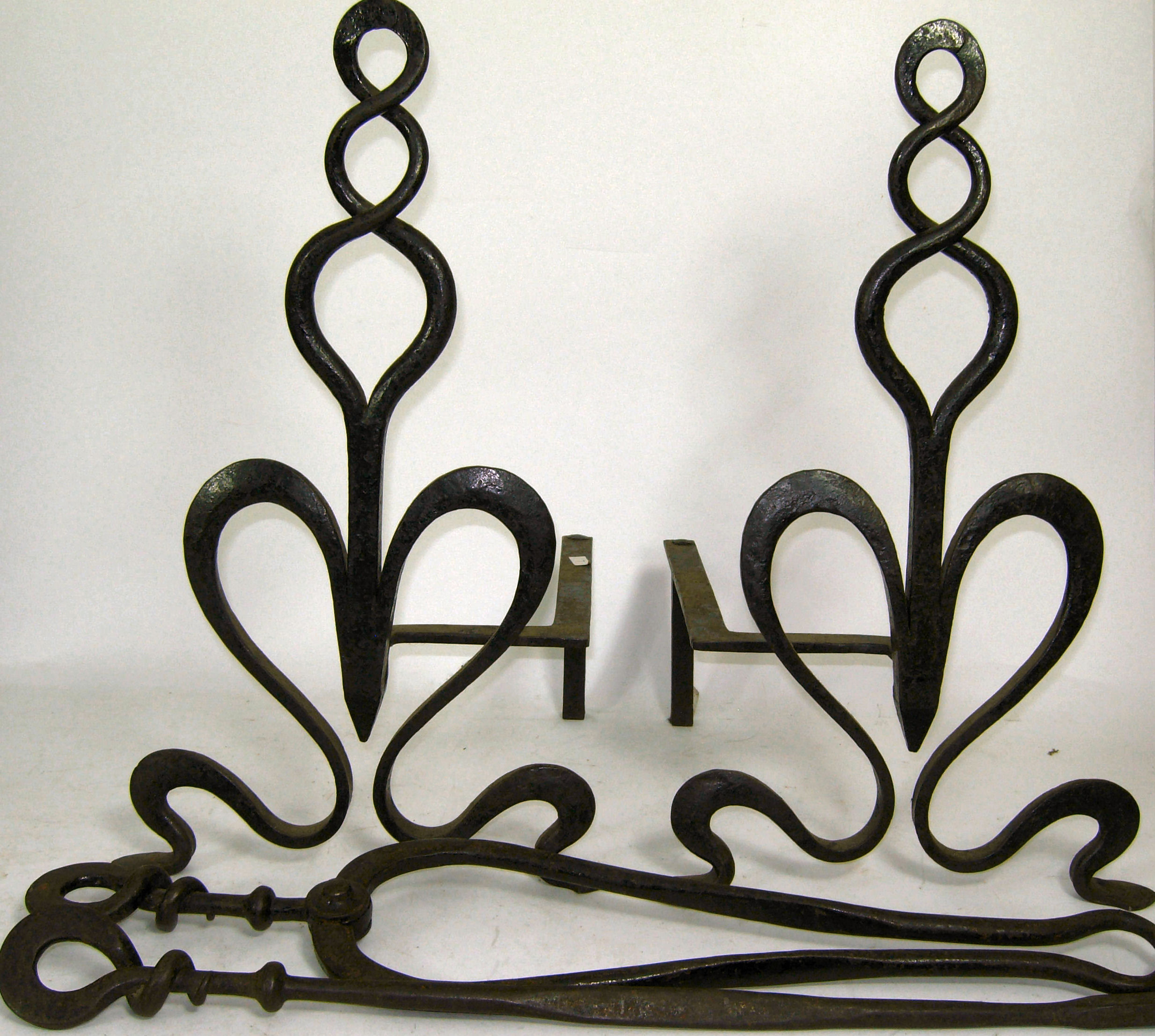 of inter woven heart shaped scroll design, on three feet, with a matching poker and tongs (4)