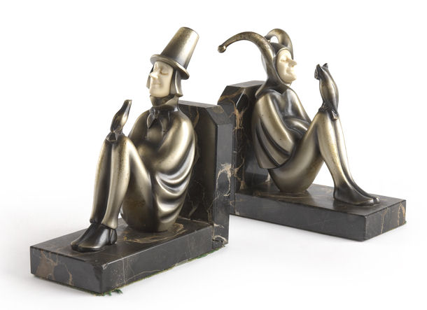 bronze and ivory, depicting two seated jesters with eccentric headgear, each with birds perched on their knees, raised on marble plinths, signed on the plinths 'Roland Paris' (2)