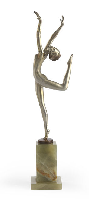 patinated bronze, cast as a naked female dancer, with silvered patination raised on a stepped green onyx base, signed in the bronze