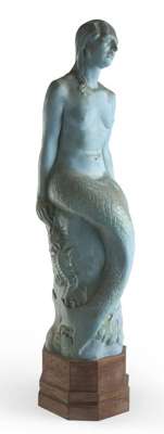 green patinated plaster figure, raised on a facetted oak plinth, bears paper label to base inscribed 'Meryl Watts, 13 St Germans Place, Blackheath, S.E.3/ The Mermaid'