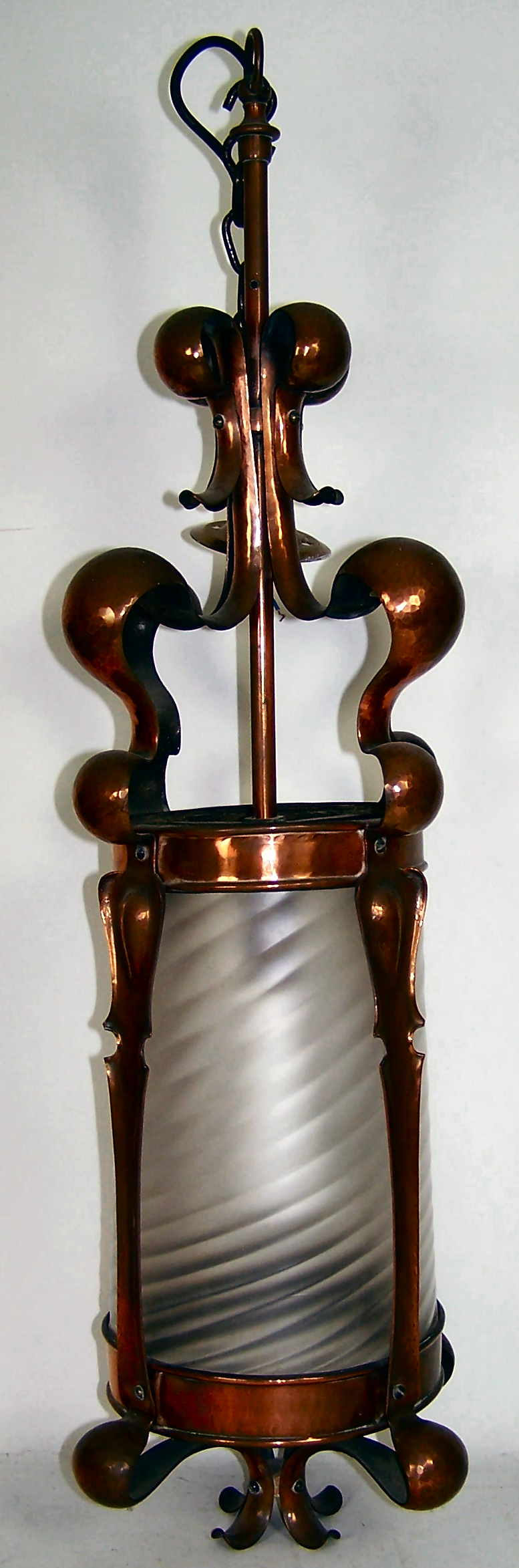 copper, the cylindrical glass spirally ribbed shade within shaped frame with scrolling brackets