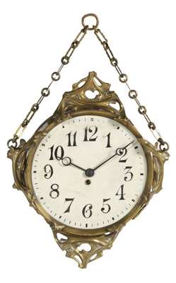 brass cased, the circular painted dial within cylindrical case decorated with cast whiplash foliage, hanging chain