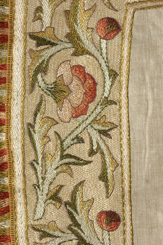 silkwork, worked in coloured threads with a frieze of flowering foliage reserved on an unbleached linen ground