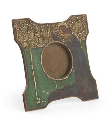 stained beech overpainted in colours with applied gesso, depicting a maiden in a flower-filled bower, indistinctly signed