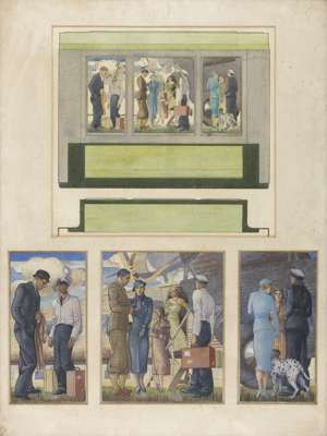 'Sketch Scene - "Whether" watercolour 34cm x 36cm; 26cm x 20cm; two at 26cm x 13cm Bears Glasgow School of Art label 'Design for a fireplace' watercolour 50cm x 40cm Mermaids pair of silk batik panels 70cm x 29cm and two others by the same hand (6)