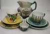 to include a facetted jug, 12.5cm high; and two trios, each painted with fruits and flowers, painted marks (7)
