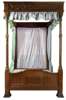 the canopy carved with Gothic tracery and with rosette and flowerhead motifs above a plain head board with material covering, the front supports spirally moulded and imbricated with flowerheads, shields and acorn motifs, joined by a shaped triple panel foot board corresponding to the canopy