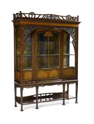 the elaborate pierced gallery above an inlaid frieze above arched canopy, pierced and inlaid with Art Nouveau whiplash foliage and enclosing an astragal glazed door flanked by corresponding panels and raised on square tapering legs linked by a lower stretcher