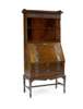 the superstructure with three quarter gallery and carved leafy frieze above two open bookshelves, the lower section with sloping fall embellished with decorative copper hinges and two drawers, the whole raised on square legs linked by stretchers