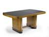 comprising a sideboard, the semi-bowed top with two drawers and four cupboards below, 152cm wide; a side cabinet of bowed form with concave central section flanked by drawers with single cupboard below, 137cm wide; an extending dining table, the black laminated top above twin pillars with black plinths, 158cm long, 76cm high, 106cm wide; and six matching chairs, each with cowled backs and white rexine upholstery (9)