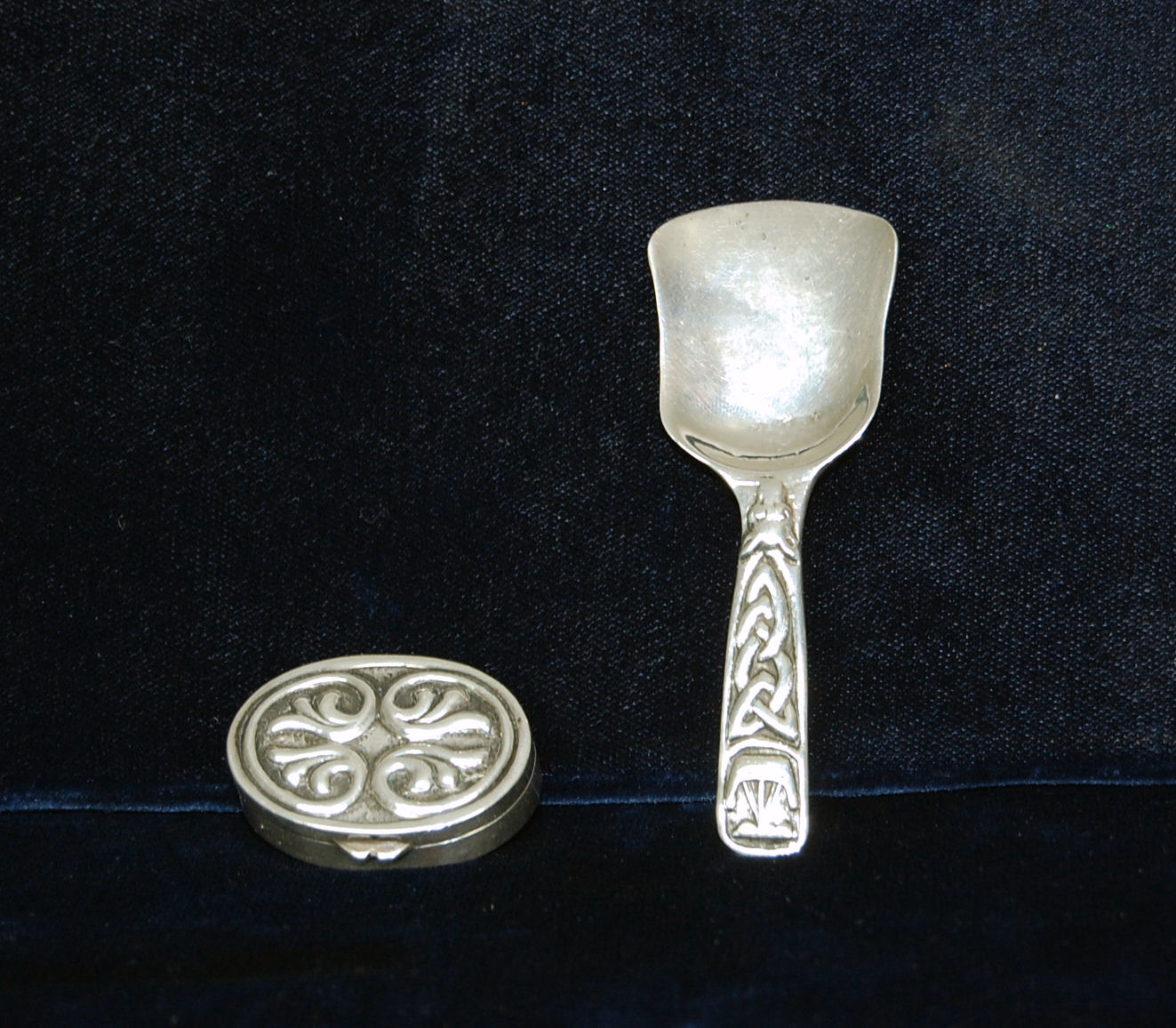 with anthemion cast hinged cover, rubbed marks for Chester 1904 (?), AR, IONA and numbered 4; also a Highland Home Industries silver caddy spoon, Edinburgh 1946, also stamped IONA, with planished shovel shaped bowl, animal mask and Celtic scroll cast stem and ship cast terminal (2)