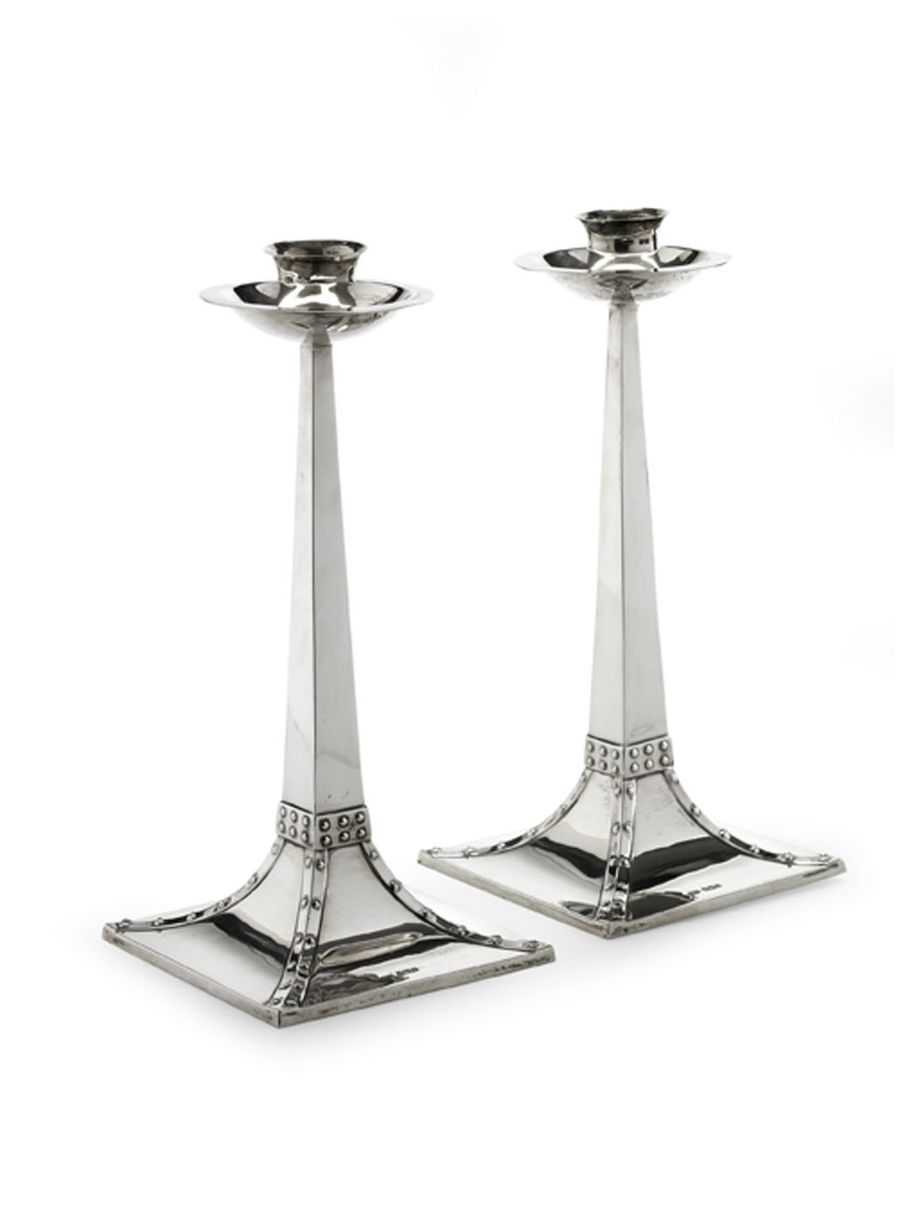 each with circular dished drip trays above square tapering columns and spreading bases with riveted decoration, marks for Sheffield 1909(2)