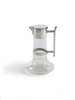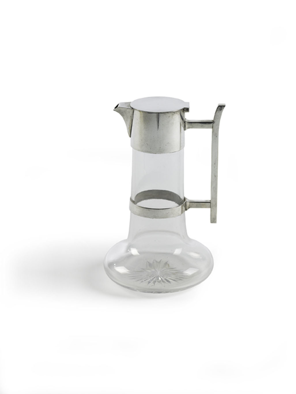 the circular hinged lid and cylindrical collar mount with angular handle above clear glass cylindrical body with bulbous base, stamped marks