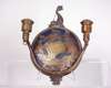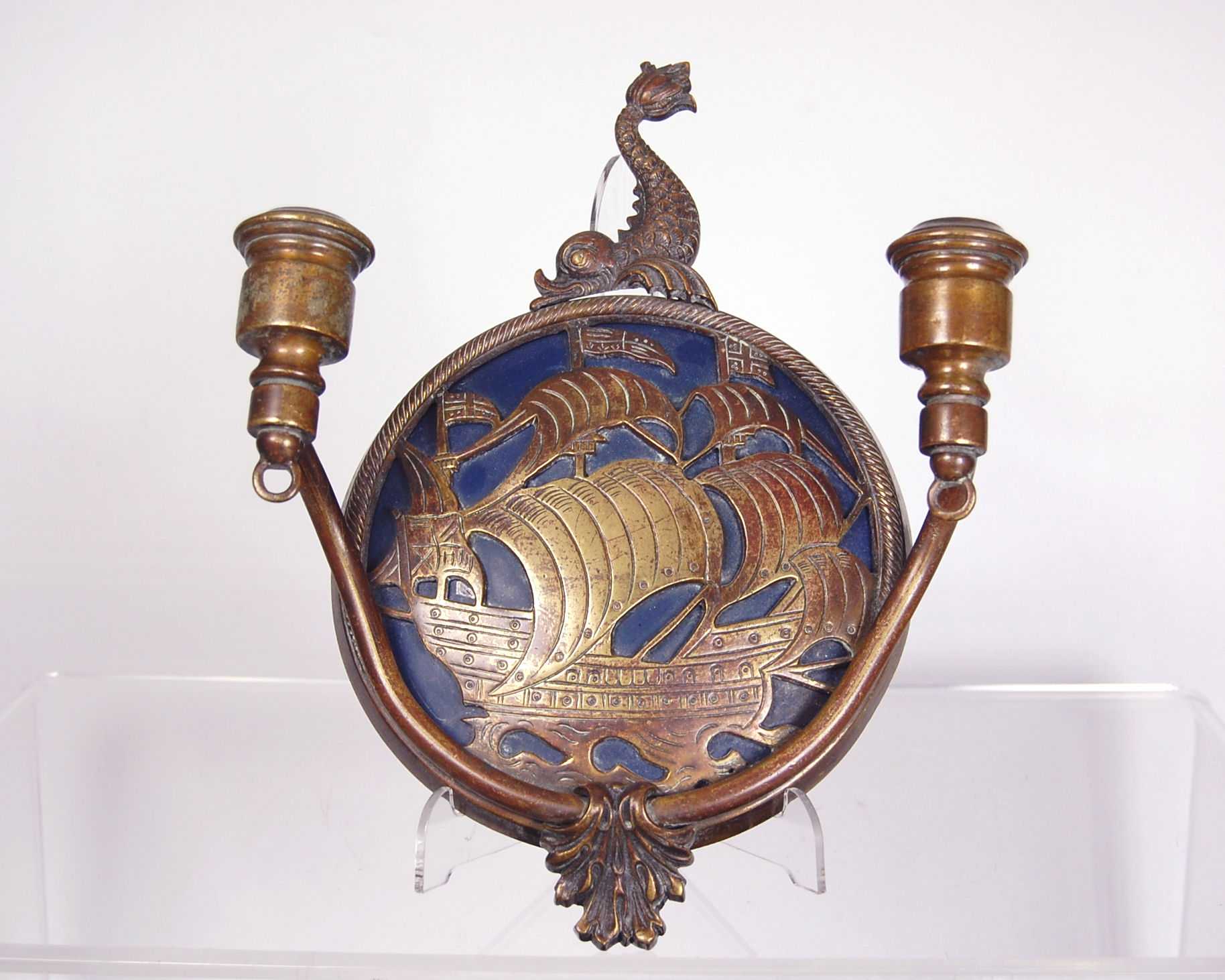 round wall plaque, decorated with a galleon in full sail on a dark blue enamelled background, flanked on either side by applied brackets with cylindrical nozzles
