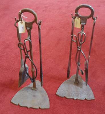 each with poker, coal nippers and ash shovel, supported on a stand with hoop handle and shaped spreading base (2)