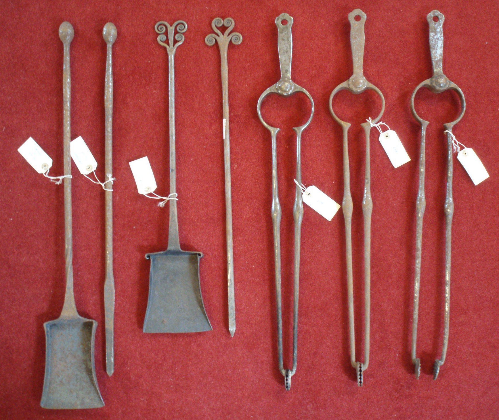 comprising a matching ash shovel and poker with scrolling terminals, poker 61cm long; three pairs of matching coal nippers, and a further matching poker and ash shovel with plain terminals (7)