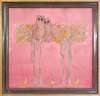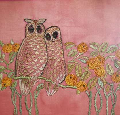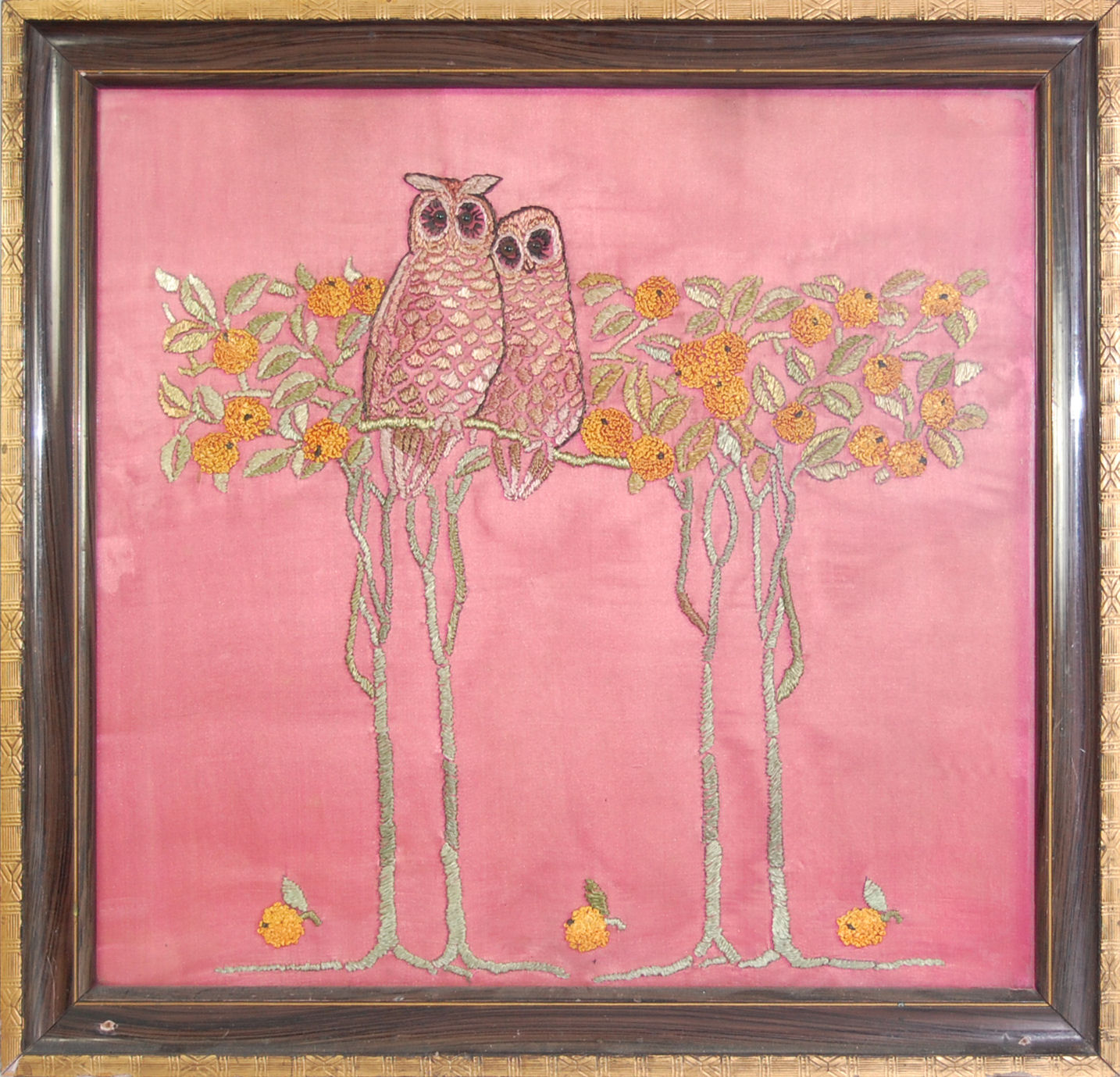 worked in coloured silks with two owls perched in stylised flowering trees reserved on a coral silk ground, framed and glazed