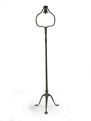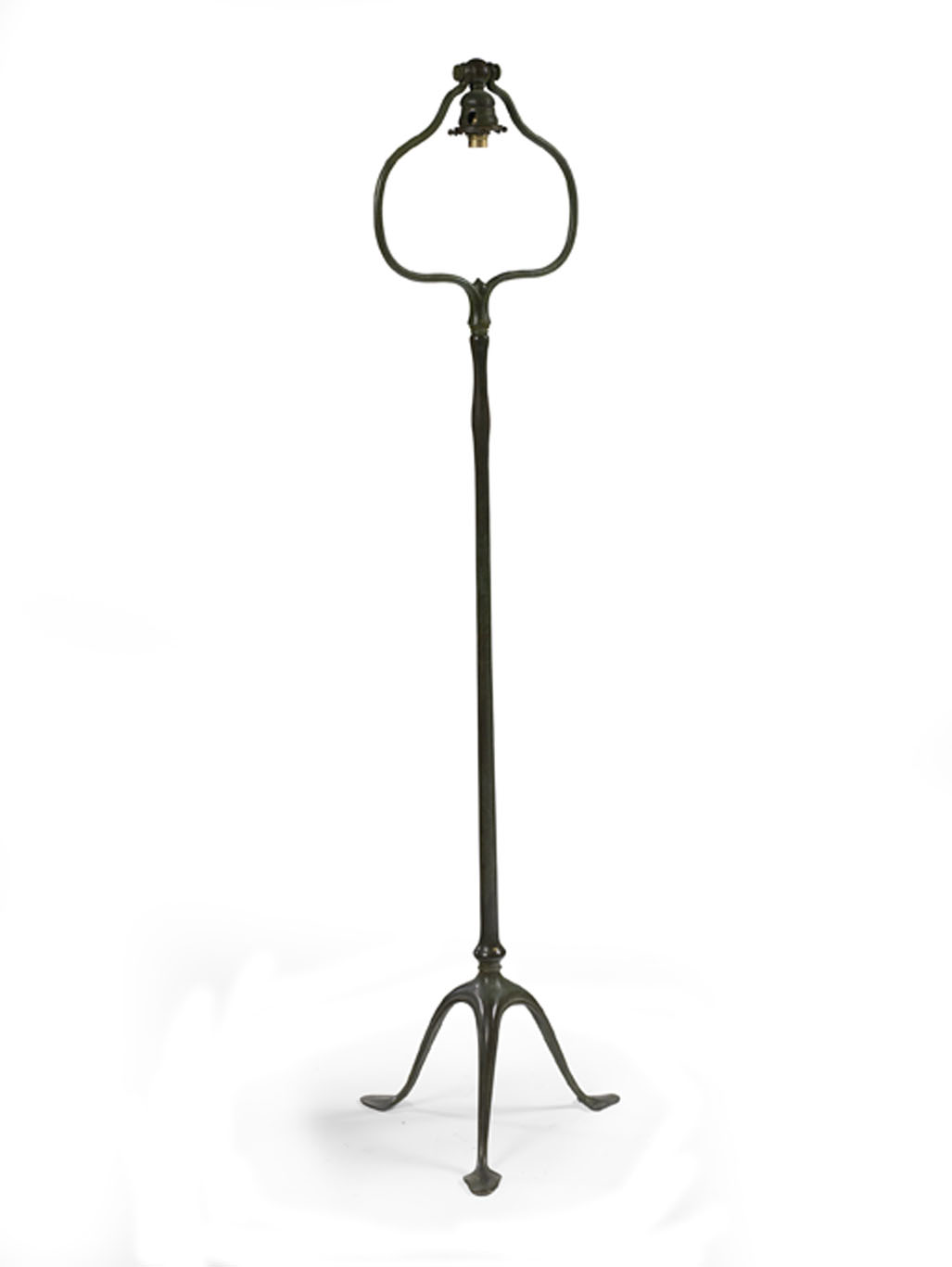 the adjustable shade support 9now with shade lacking) above a shaped turned column on tripod base with shaped pointed pad feet, green patination, stamped under one foot 'Tiffany Studios/ New York/ 423'