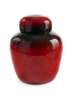 the shouldered ovoid body in red mottled glass with amethyst and aventurine, inclusions to the rim and with corresponding lid, bears paper label (2)