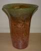 of tapering cylindrical form, with flared rim, the strawberry body with milky veined inclusions decorated to the rim with swirls of aventurine inclusions on a green ground, 28.5cm high, also a circular Monart bowl (cracked) (2)