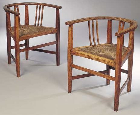 the curved back and arms above pierced splat and spindle supports, the drop-in rush seats on square tapered legs united by stretchers (2)